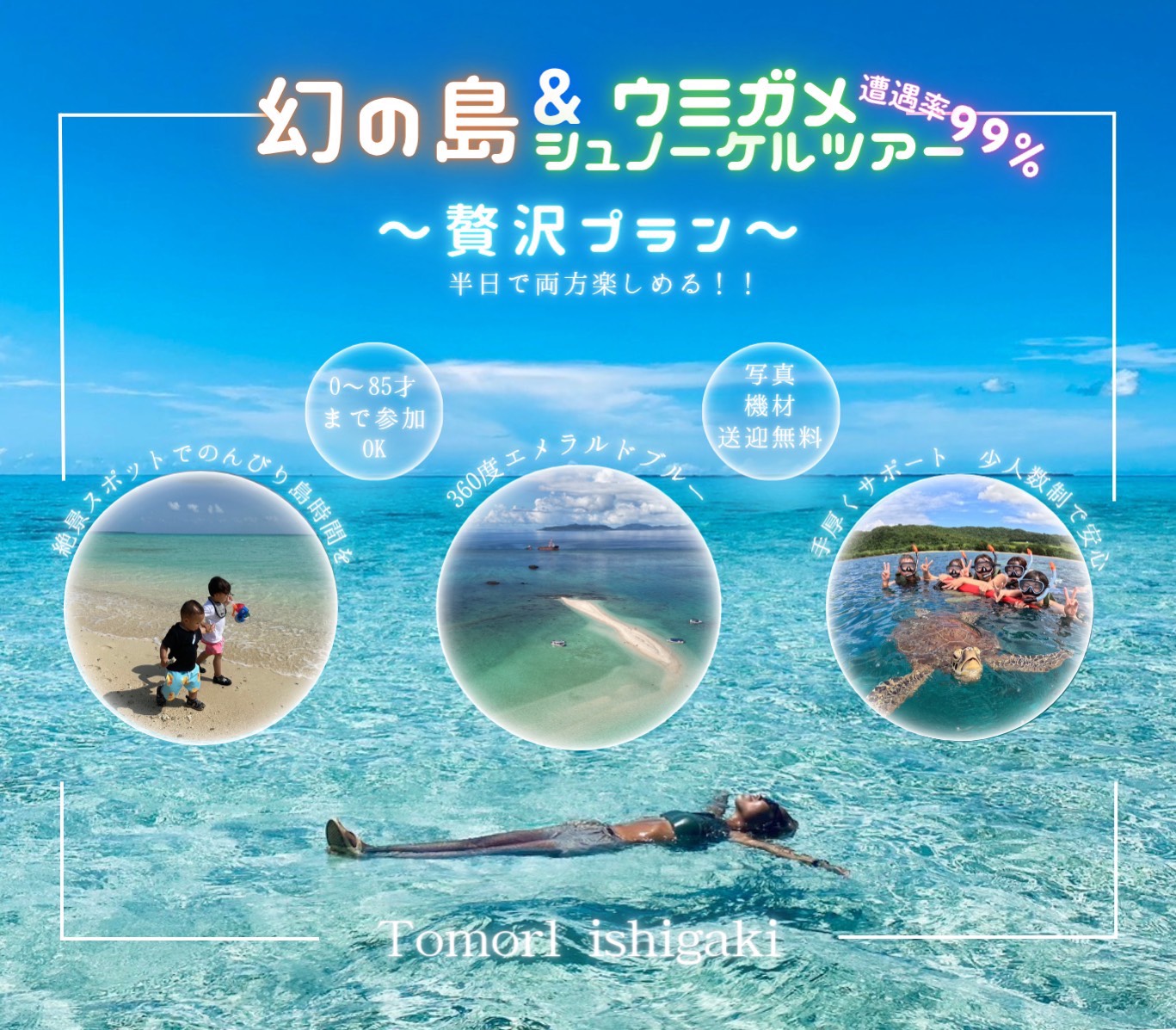 「石垣島に来たなら一度は訪れたい」と言われる人気スポット“幻の島”──当店ではこれまでウミガメに特化したツアーのみをご提供していましたが、多くのお客様から「Tomorlでも幻の島に行きたい!」というご要望をいただき、このたびついに新プランが誕生しました!大好評のウミガメシュノーケルに幻の島上陸を組み合わせた、特別な体験ができる欲張りプランです。ウミガメとの高確率な出会いと、絶景の幻の島を一度に楽しめる、大満足の内容となっています。 ①幻の島とは? 「幻の島」と呼ばれる無人島・浜島は、360度エメラルドブルーの海に囲まれた絶景スポット。潮の満ち引きで姿を変える神秘的な島で、訪れるたびに違う表情を楽しめます。船でしか行けない特別な場所だからこそ、上陸体験は一生の思い出に。クルージング中の景色や、のんびり過ごす島時間も魅力。泳げない方やお子さま連れでも安心して楽しんで頂けます ②Tomorl石垣島のウミガメシュノーケルコースでは、3年連続で遭遇率100%を達成中。経験豊富なスタッフがウミガメを全力で探し、安全に楽しめるようサポートします。機材の使い方や注意事項も事前にしっかりレクチャーするので、初心者や泳ぎが不安な方も安心してご参加いただけます。ウミガメだけでなく、美しいサンゴや色とりどりの熱帯魚など、南国ならではの海の世界をたっぷり満喫できるのも魅力です。 ※ウミガメポイントは当日の海況次第では行けない可能性があります。ポイントに行けない場合は珊瑚シュノーケルになります。前日か当日にお電話又はメールにてご相談します。 ※シュノーケルの対象年齢は2歳から65歳までとなります。 対象外のお客様は幻上陸後船での待機となります ※当日予約は開始時刻の3時間前までの受付となります。 ご予約確定後でもご予約をお断りさせて頂く場合がございます 【ツアースケジュールのご案内】 ■ 出航時間 午前便:8:00 出航 午後便:12:30 出航 現地集合の場合は、出航時間の30分前までに集合をお願いします。 送迎をご希望の場合は、エリアによってお迎え時間が異なります。 ご予約時または前日に、メールまたはメッセージでご案内いたします。 目安として、出航の1時間〜45分前にお迎えに伺います。 ⸻ ※天候や海況により、所要時間や内容が変更になる場合があります。 【少人数制&当日予約OK!】 旅客定員10名の小型ボートでゆったり。お天気を見てその日に予約・参加できるのも魅力! 女子旅、男子旅、家族旅行、団体旅行、社員旅行、 卒業旅行など、どなた様でもお気軽にご参加できます♪ 【大人気幻の島へ】 人気スポット「幻の島」へ上陸し、自然のままの美しさを背景に、思わずシェアしたくなるような写真をたくさん撮影できます。貝殻やサンゴのかけらを見つけて遊んだり、足元だけ海に浸かってリフレッシュしたりと、小さなお子さまからご年配の方まで気軽に楽しめる島時間をご提供。シュノーケリングを希望されない方や泳ぎが苦手な方も、幻の島の滞在だけで十分にご満足いただける内容です。ご参加は0歳〜85歳まで参加可能です 【はじめての海でも安心。ウミガメと出会いをしっかりサポート】 シュノーケリングが初めての方や、泳ぐことに不安がある方も大歓迎!当店では、シュノーケルインストラクターのライセンスを持つ経験豊富なスタッフが、機材の使い方から泳ぎ方まで丁寧にレクチャーいたしますので、どなたでも安心してご参加いただけます。安全を最優先に、ウミガメとの出会いを全力でサポートし、感動の瞬間はスタッフが水中カメラでしっかり撮影。思い出に残るひとときを、そのままお持ち帰りいただけます。 【参加時のお願い】 Tomorlのツアーにご参加いただく皆さまが、安全に・楽しくお過ごしいただけるよう、以下の内容を必ずご確認ください。 ■ ツアー前の確認事項 ・プラン記載内容は事前確認が前提です ・予約確定後に送付される【確認メッセージ(集合場所・時間)】も必ずご確認ください ・他のお客様との兼ね合いにより、確定後でもご予約をお断りする場合があります ■ ツアーの中止・変更について 以下の理由で中止・変更となる場合があります: ・悪天候・海況不良 ・急な天候悪化の予測(前線通過など) ・ガイド判断で安全確保が難しい場合 ・集合場所変更(前日or当日に連絡) ・船や送迎車の故障 ※中止・変更時はメールまたは電話でご連絡します ■ 参加条件・健康管理 ・参加対象年齢:2歳〜70歳(60歳以上の方はご相談ください) ・以下の方は、医師の診断書をご提出いただく場合があります: その他特記事項 - 妊娠中の方 - 精神疾患をお持ちの方(てんかん・認知症など) - 心臓・呼吸器疾患、糖尿病、高血圧のある方 ・体調不良を感じた場合は、すぐにスタッフへお知らせください。 ※お酒の持ち込み・乗船前の飲酒は固くお断りしております。 飲酒が確認された場合は当日キャンセル扱い(返金不可)となりますのでご注意ください。 ■ お子様のご参加